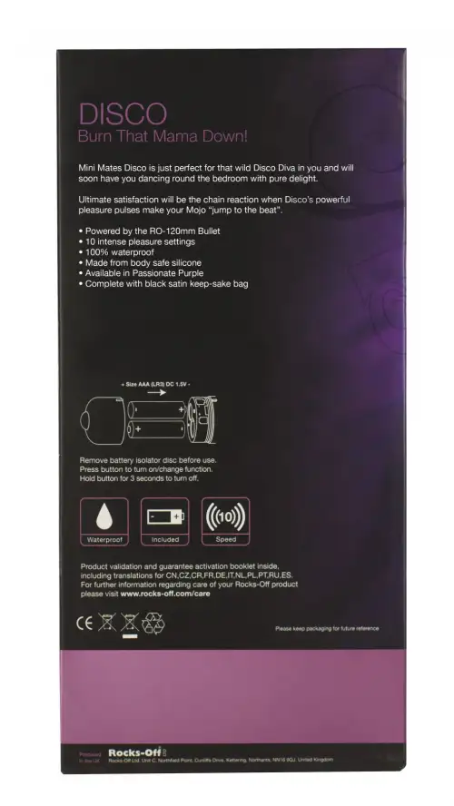 Rocks Off Mini-Mates 10 Disco имеет длину 12 см, что упрощает вставку и использование. Его компактный размер также делает его идеальным для путешествий или незаметного хранения. Если вы ищете одиночную игру или хотите оживить отношения со своим партнером, этот вибратор обязательно вам подойдет.