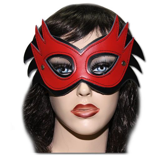 Маска для создания БДСМ сессий, выполнена в красно-черных тонах из натуральной кожи. Декорирована маска металлическими заклепками. Размер маски регулируется при помощи резинки.
