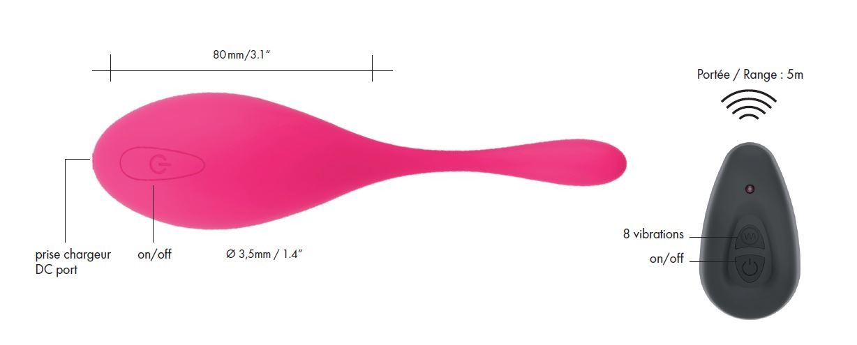 Виброяйцо уникальной формы для глубокой стимуляции. Имеет 8 режимов вибрации. Пульт дистанционного управления работает на расстоянии до 10 м. Длина - 8 см, диаметр - 3,5 см. Материал - водонепроницаемый силикон. Страна производитель - Франция.