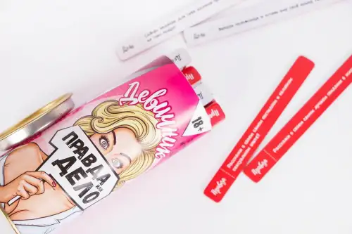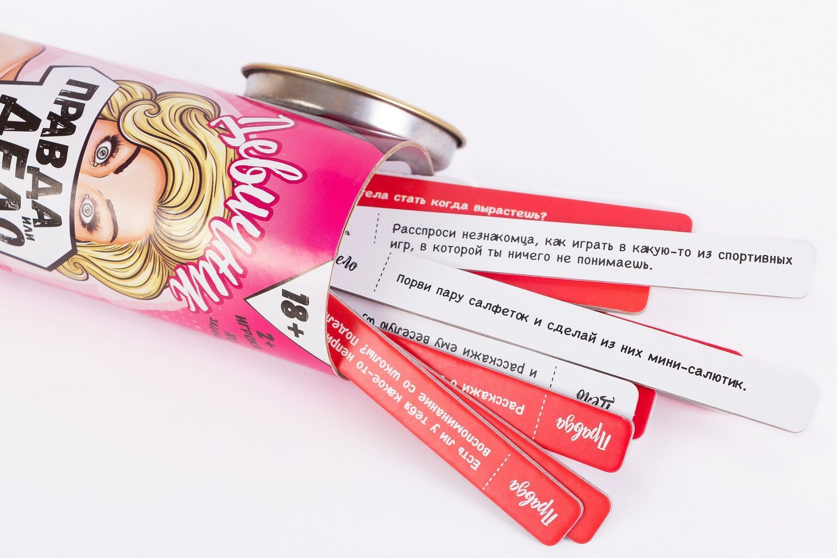 Карточки выполнены из качественного плотного картона. Поэтому можете не переживать, что они испортятся по ходу игры. При этом вопросы окрашены в красный цвет и имеют пометку «правда». Различные задания (то есть, «дела») напечатаны на картоне белого цвета.